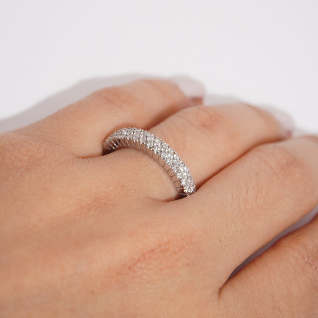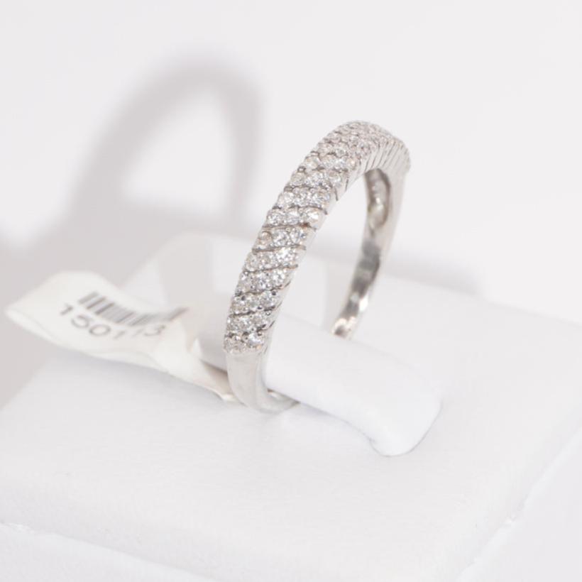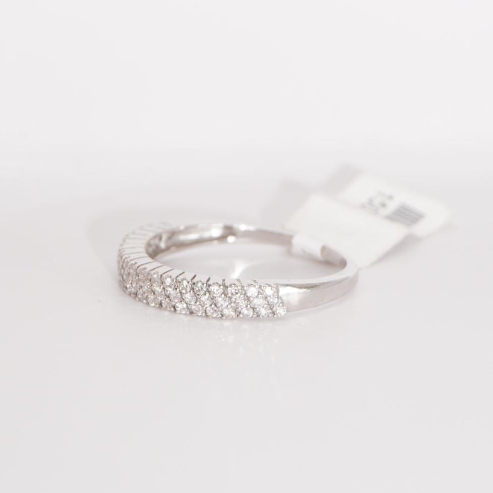 Este elegante anillo de diamantes en oro blanco es la perfecta combinación de sofisticación y brillo atemporal. Su diseño clásico presenta una delicada banda de oro blanco de alta calidad, adornada con diamantes brillantes que capturan la luz de manera espectacular. Cada diamante, cuidadosamente seleccionado, se coloca con precisión para resaltar su máxima luminosidad y crear un efecto deslumbrante que encantará a quien lo lleve.