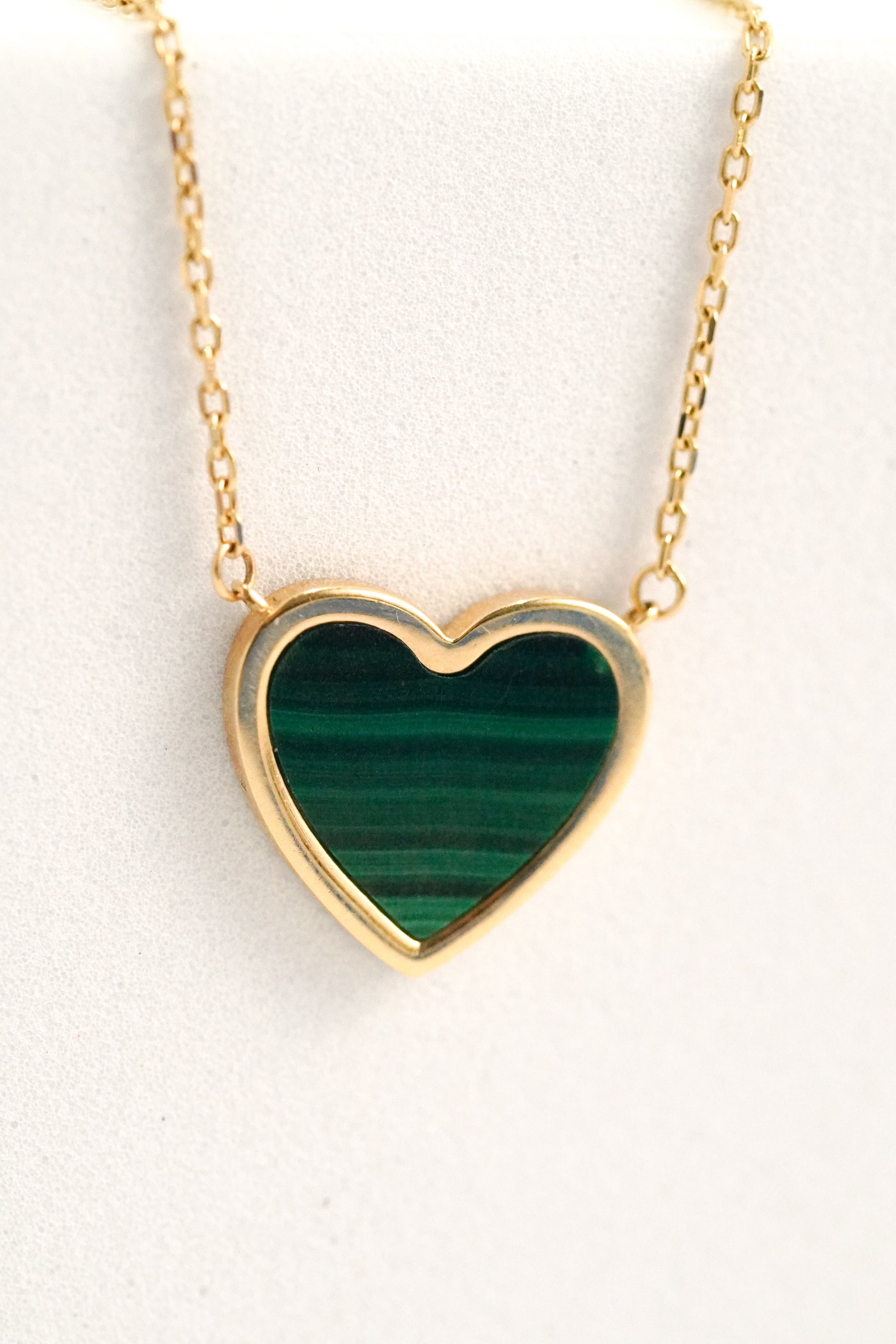 Descubre la delicadeza italiana en esta cadena de oro de 18K con dije en forma de corazón, realzado con malaquita natural, piedra de protección y transformación.