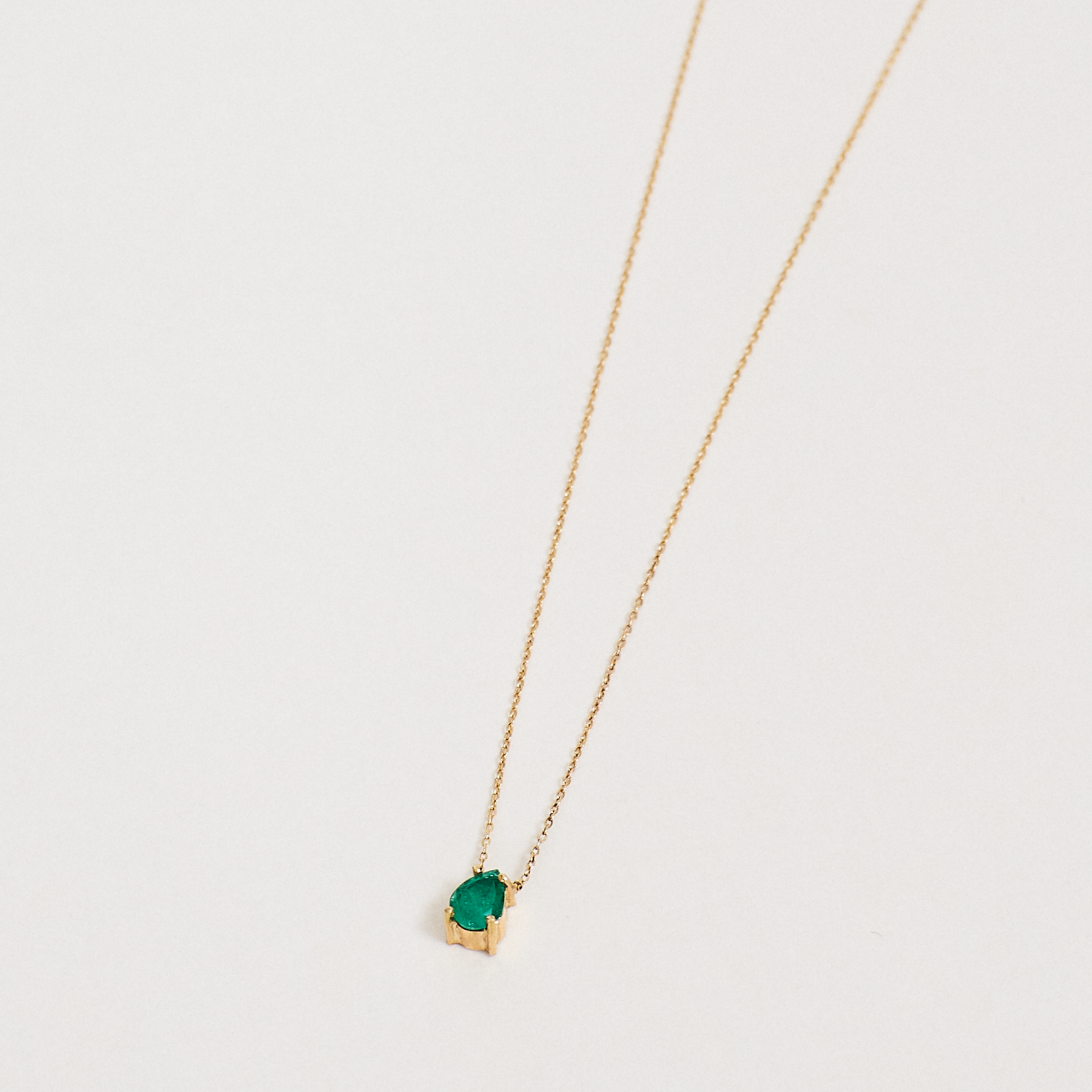 Cadena y dije en oro de 18k con una esmeralda en forma de gota de 5x4mm, una joya que combina elegancia y sofisticación.