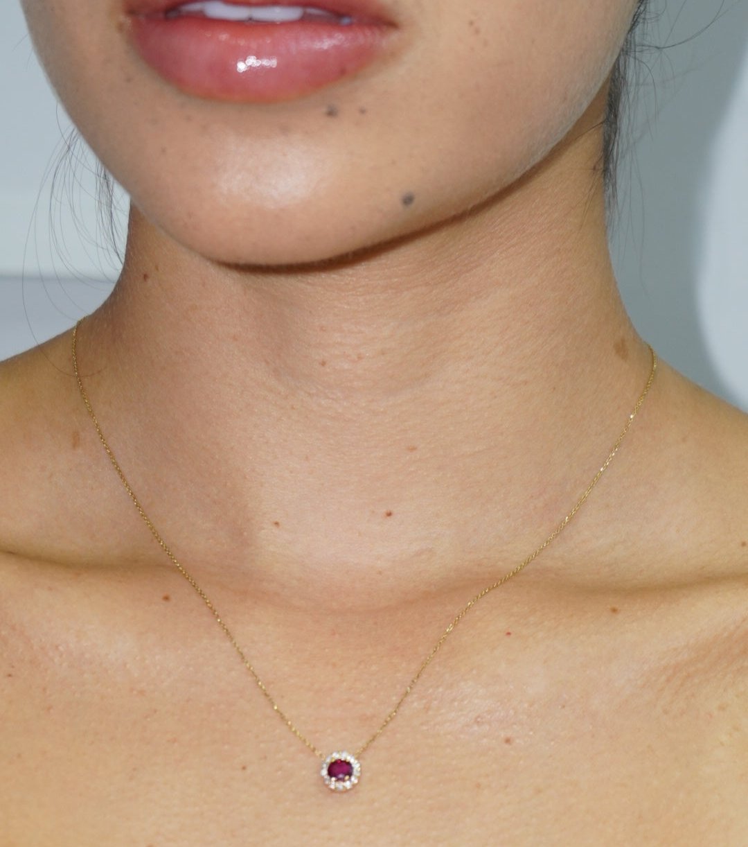 Destaca con esta impresionante cadena de oro 18K con un dije central de rubi con diamantes alrededor.