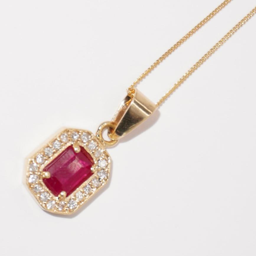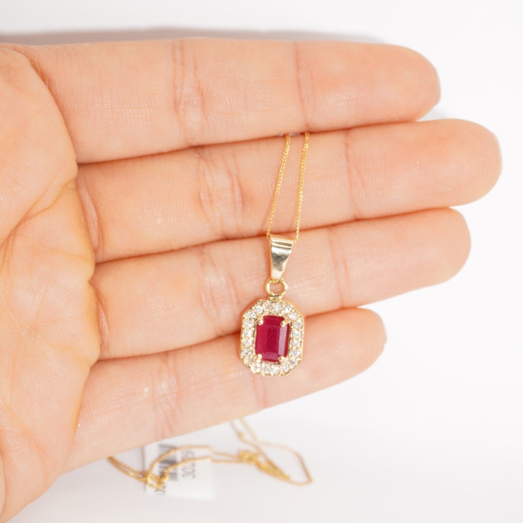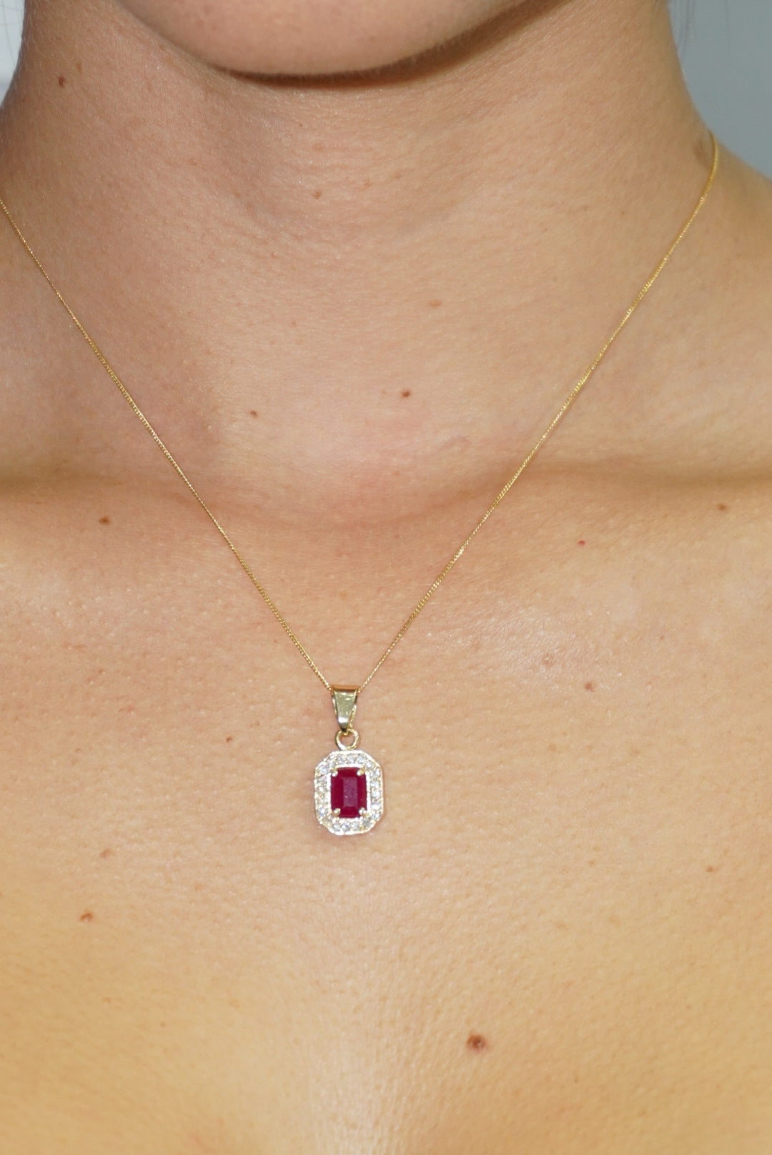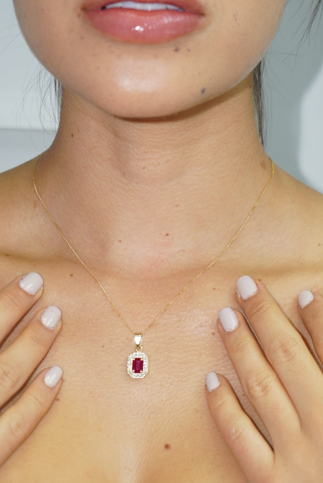 El dije, con su forma geométrica perfecta, enmarca un rubí en el centro, cuya tonalidad roja vibrante y profunda resplandece con una intensidad cautivadora. Rodeando el rubí, un halo de diamantes pequeños acentúa su belleza, agregando un brillo adicional que resalta el contraste entre el fuego del rubí y el destello de los diamantes.