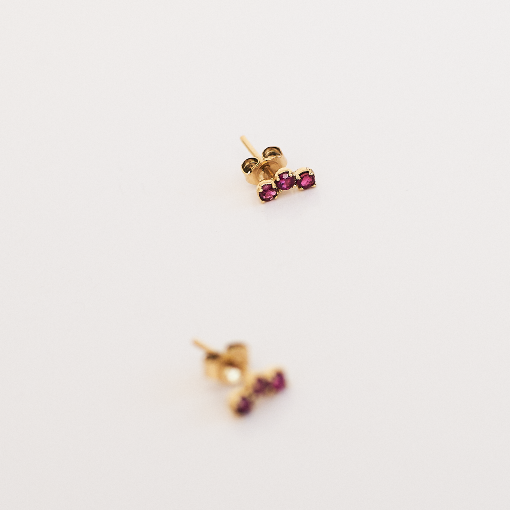 Aretes elaborados en Rubíes naturales de 2,5 mm y oro de 18K, El Rubí es una piedra muy poderosa, con un gran magnetismo, y tiene diversos significados relacionados con las emociones y la salud. Por su característico color rojo, es la piedra del amor.