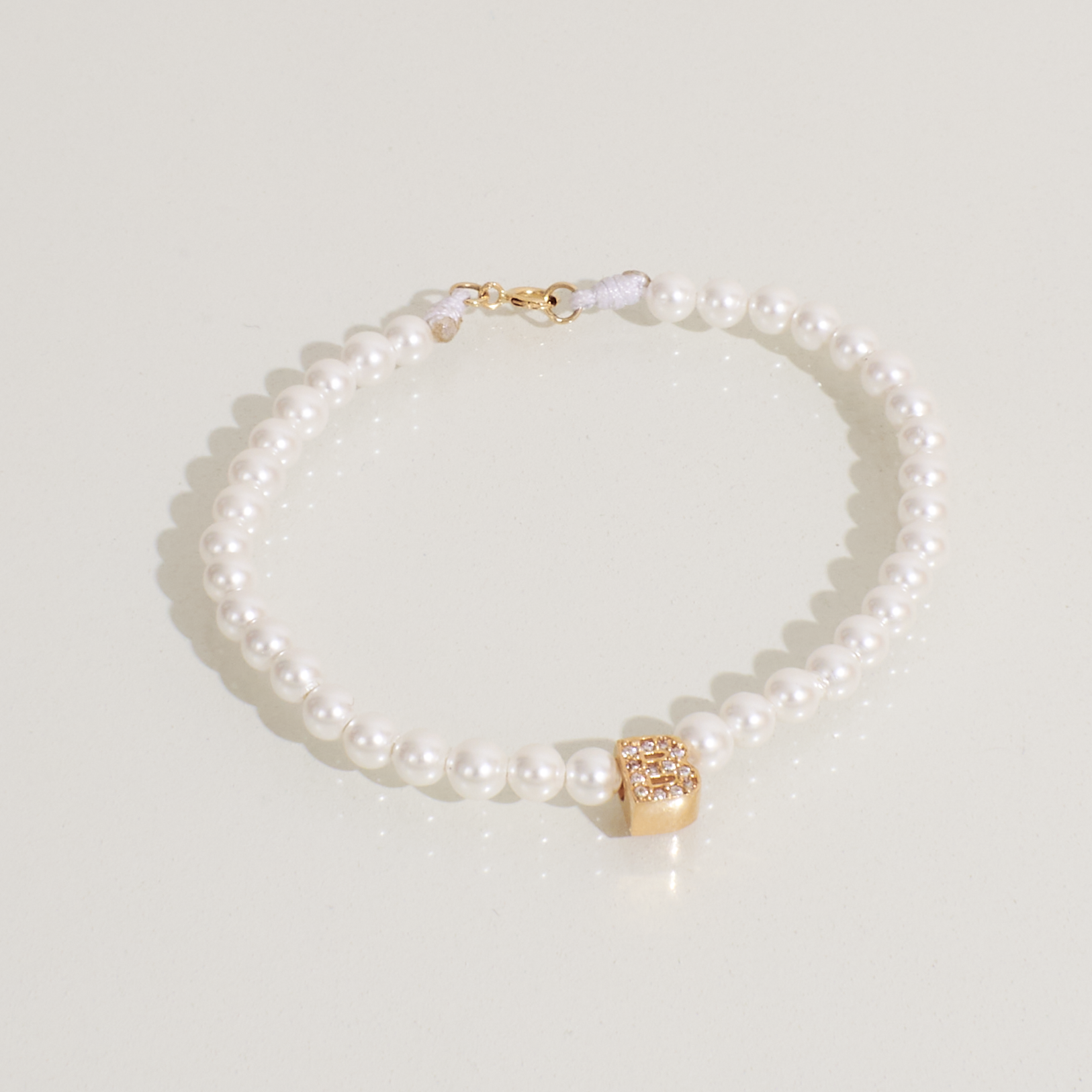 Pulsera hecha en polvo de nácar personalizada con inicial engastada en circón Swarovski elaborada en oro de 18k.