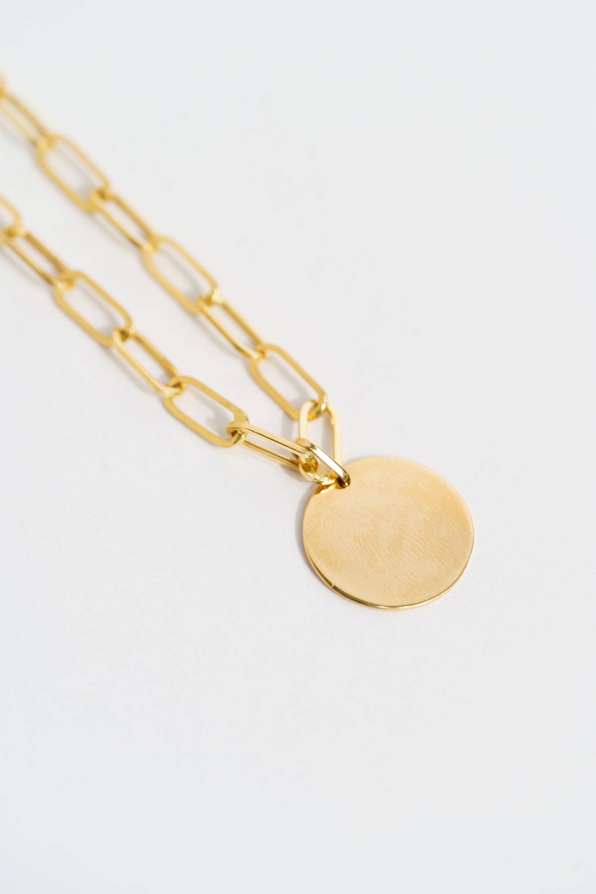 Este medallón grande en oro de 18K está hecho para destacar. Una pieza que no pasa desapercibida y que se convierte en protagonista desde el primer momento. Su tamaño y brillo hacen de este medallón una joya con carácter, perfecta para llevar sola o guardar en ella un significado especial.