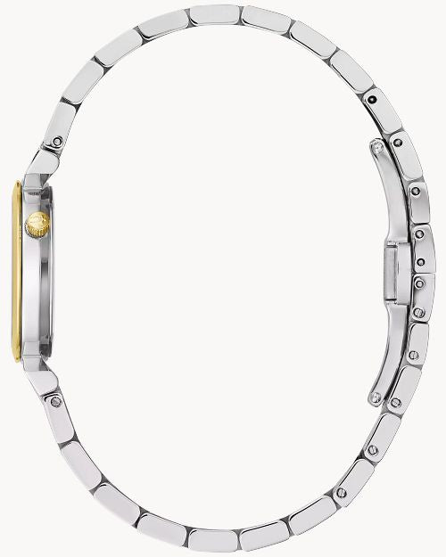 Inspirado en los relojes clásicos de Bulova, el pequeño Regata de acero inoxidable de dos tonos, presenta una esfera de nácar blanco brllante engastada con 11 diamantes. Incluye un cristal de zafiro plano, movimiento de cuarzo delgado.